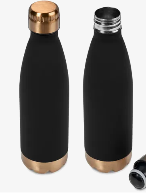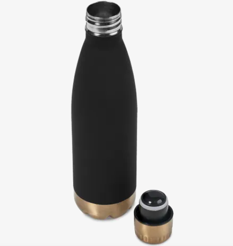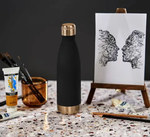 A construção a vácuo de parede dupla desta garrafa de 500 ml mantém os líquidos quentes ou frios durante horas. Esta garrafa tem um acabamento preto emborrachado e uma tampa e base douradas, o que lhe confere o equilíbrio perfeito entre moda e funcionalidade.